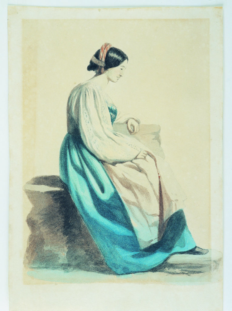 Figura feminina, sentada de perfil. Cabeça reclinada para baixo, pé direito sobre uma pedra, mão direita apoiada sobre as pernas e esquerda sobre uma pedra. Saia azul, avental branco, blusa branca de manga comprida , cabelo de cor preta, preso com fivela e um torçado duplo avermelhado em volta do coque.