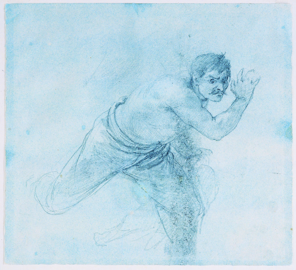 Homem em posição de corrida sem camisa e com calça. Braço direito levantado na altura da cabeça.