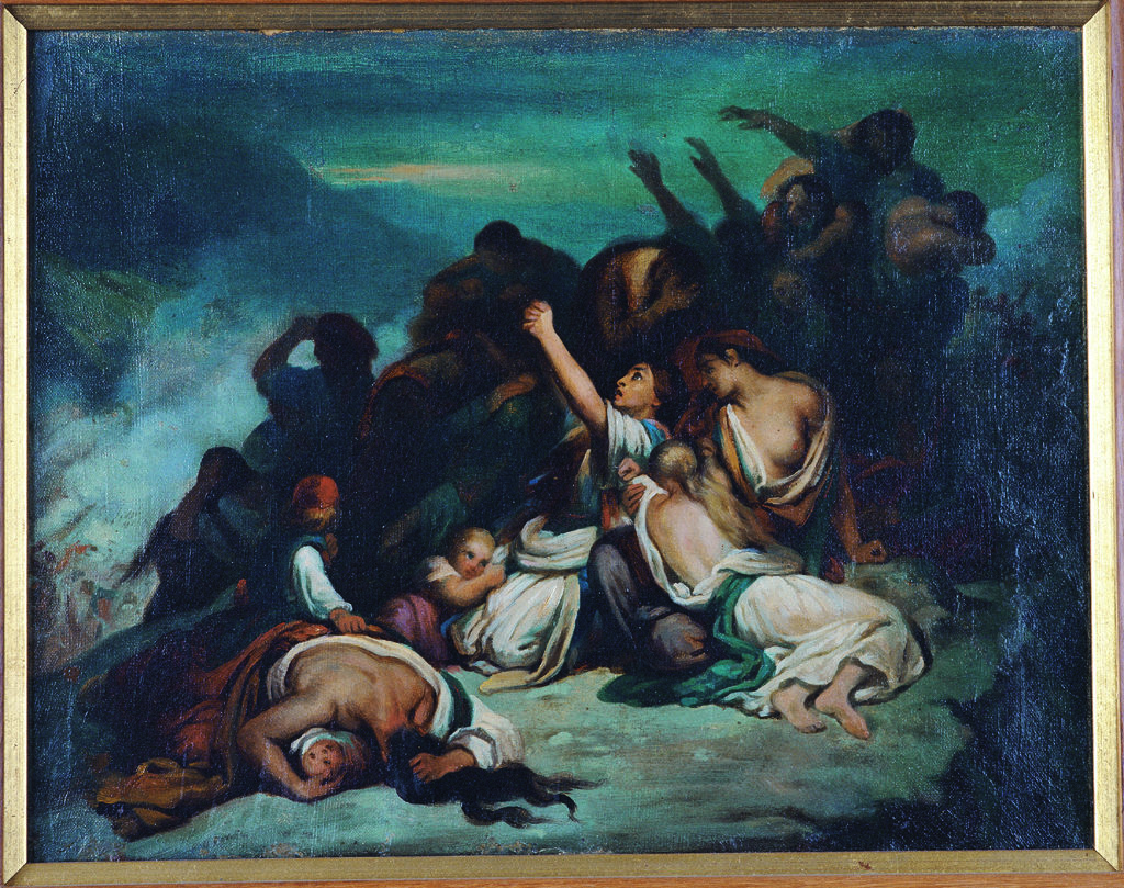 Em primeiro plano figuras femininas e crianças seminuas. Ao fundo cena de batalha.
