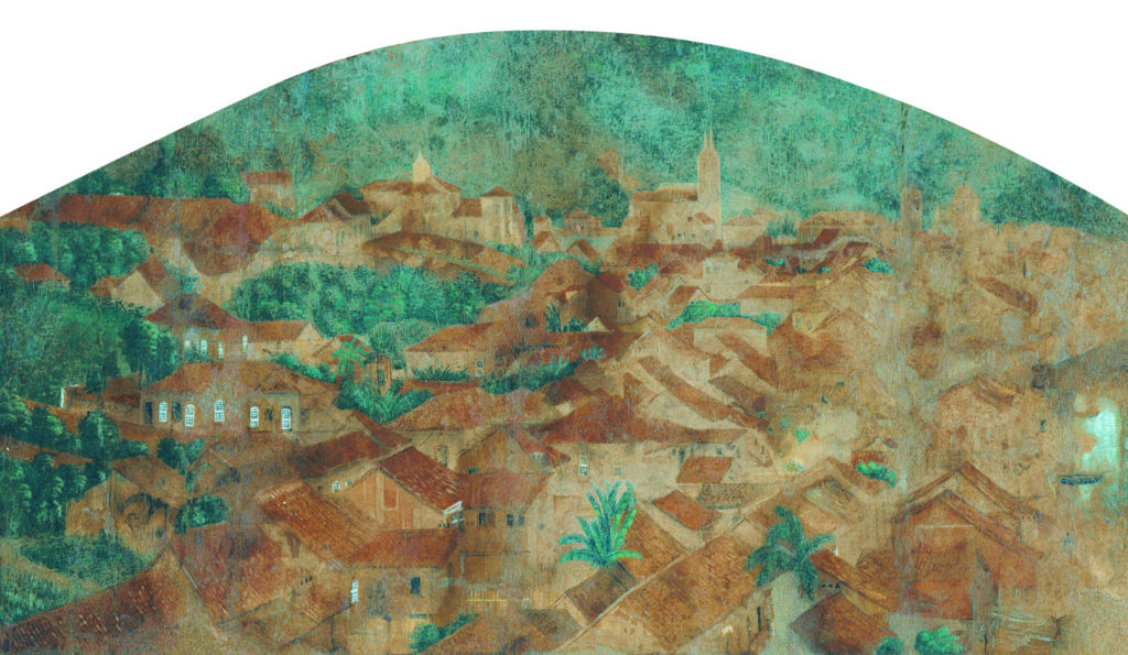 Em primeiro plano casario tendo os telhados em maior evidência. Ao fundo, vegetação, campanário e torres de igrejas.