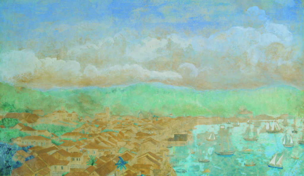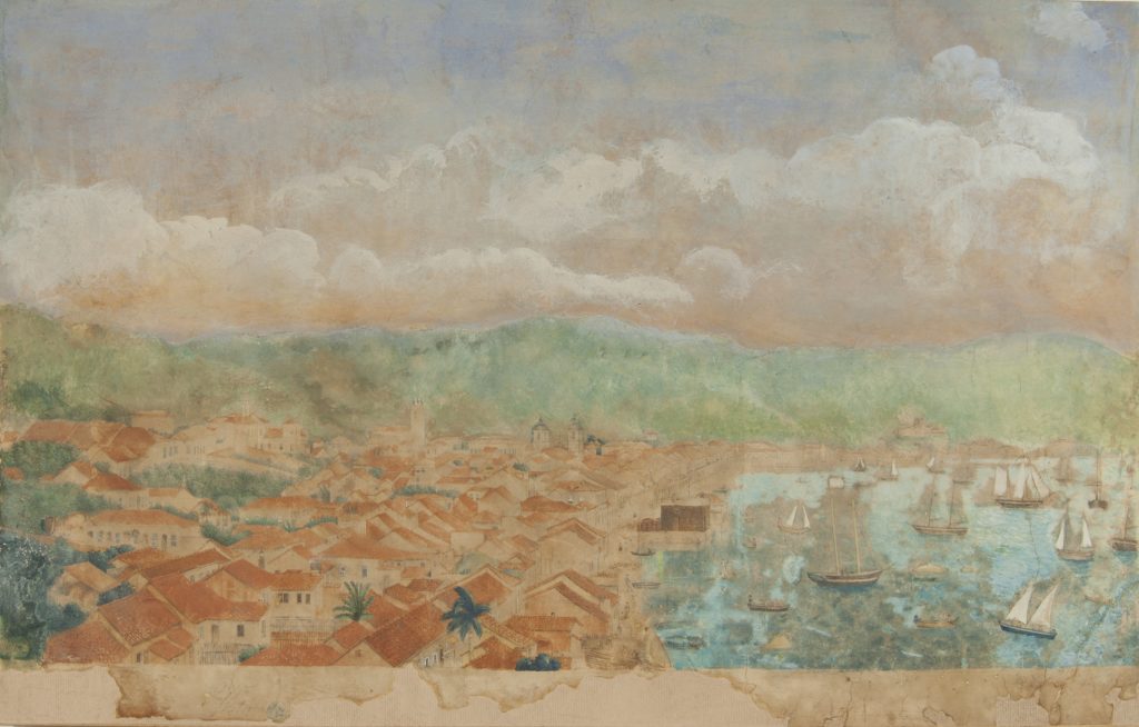 Vista parcial de uma cidade. Em primeiro plano, à direita, porto e mar com embarcações. No lado esquerdo inferior, sobrados e casas de porta e janela, destacando-se as torres das igrejas. Ao fundo, morros com vegetação.